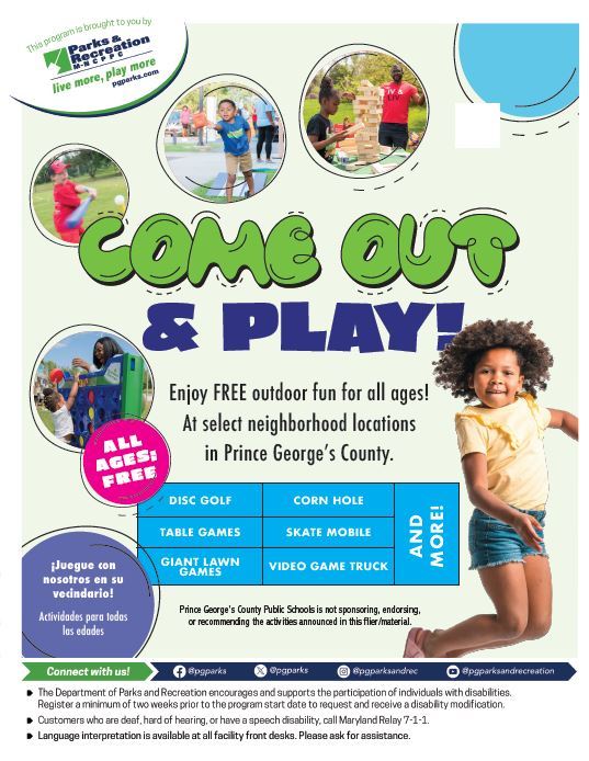 We are excited to invite you to our "Come Out and Play" event, taking place from 5-7 p.m. on Friday, May 17, 2024, on Queens Chapel Road. This free event is designed for community members of all ages to interact with the University Park Police while enjoying a variety of fun outdoor activities.